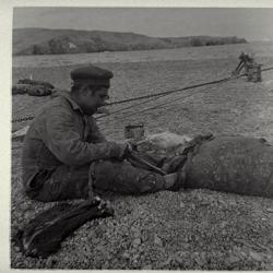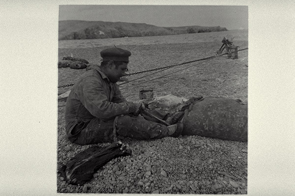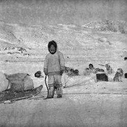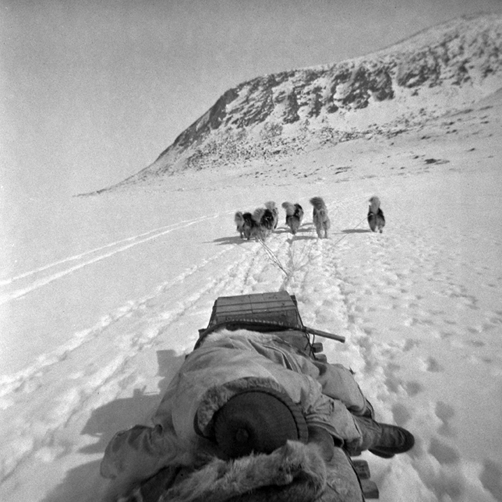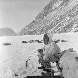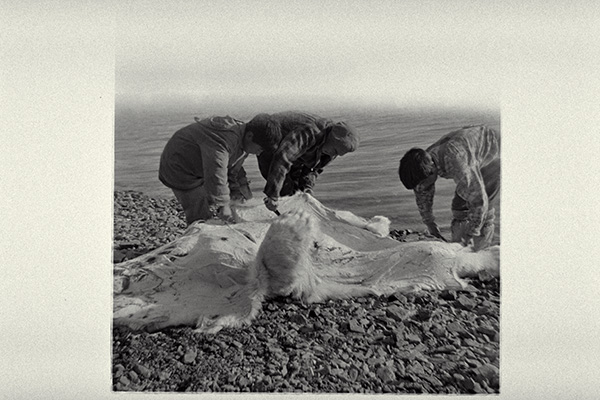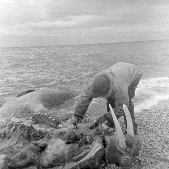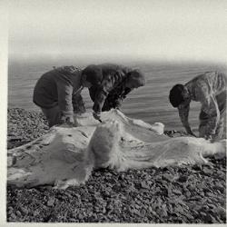 If you take a look at these photographs, you can see the ways in which Inuit in Idlout’s camp showed respect and care for the animals and land by utilizing every part of the animal, including the intestines, as shown in photo N-1979-051: 1935 which shows a hunter removing the walrus intestines to be eaten or used, and the skins (N-1979-051: 1997), (N-1979-051: 2066). But perhaps the best depiction of the close relationship between Inuit and the natural world is seen in their relationships with sled-dogs as depicted in photos N-1979-051: 1877, N-1979-051: 2023, and N-1979-051: 2027. The dogs allowed Inuit to travel long distances to hunt and could guide a hunter home even in the worst piqsiq (blizzard). They also ensured hunters’ safety by alerting them to an approaching predator through the dogs’ keen senses and loyalty. The RCMP’s slaughter of Inuit dog teams between the 1950s well into the sixties, marks a point of devastating disruption to the relationship of Inuit and the environment. The killing of sled-dogs confined Inuit to government settlements, severing their ability to freely travel the land and hunt; and in turn affecting the transfer of land-based knowledge and skills to younger generations.