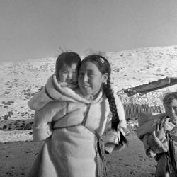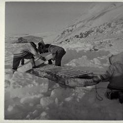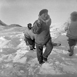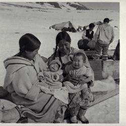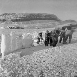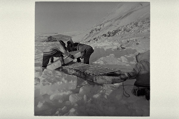 Some photos in this theme clearly show the act of working together. In the three different images of building the igluvigaq (N-1979-051: 1885, N-1979-051: 1886, N-1979-051: 1888), for example, we see all of the men lending a hand in the cutting of blocks and in their transportation. Another photograph shows men and women pulling up a polar bear that was just harvested (N-1979-051: 1994). In other images, the value of cooperation is not as clear at first glance. However, tasks such as providing care for children, butchering animals, preparing skins, and sewing clothing (N-1979-051: 2078 and N-1979-051: 2105) are also rooted in the principle of Piliriqatigiingniq/Ikajuqatigiingniq.